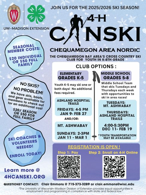 Looking for an exciting way to stay active this winter? 4-H CANSKI is the Chequamegon Bay Area’s cross-country ski club for youth in grades K–8—and we’re gearing up for an amazing 2025/2026 season!